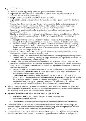 Only includes examinable material. The Notes are organised according to main topic for ease of access. Please note that these Notes only include the examinable theory behind the statistics covered in this unit. It does not contain any worked examples or formulas as these are easily available from the unit page online. I advise you to practice the statistics (by doing the practice exam questions provided on the unit site) and not just read about the theory, as the exam has a lot of questions where you need to apply the maths in order to find the answer. Goodluck! Desclaimer: I claim no ownership/credit of the knowledge/theory presented in these notes. Everything presented is what I have learned as a Psychology student.