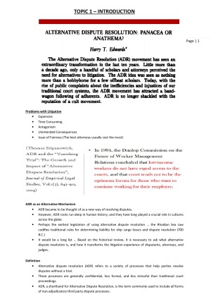 Comprehensive, clear and well-presented notes being a combination of the lecture slides plus summaries of all required readings from the textbook (Tania Sourdin, Alternative Dispute Resolution, 5th edition) with references to textbook pages for extra information where required.