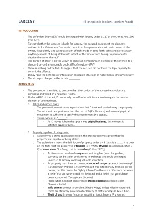 CHEAT NOTES- STRUCTURED FOR QUICK REFERENCE IN THE EXAM! No need to take 100+ pages of comprehensive notes or the textbook into the exam! These notes are a step-by-step guide to answering any problem question, and will directly apply to any given set of facts. SAVED ME SO MUCH TIME IN THE EXAM!!! These notes include: - A cheat sheet to classify which charge is relevant under the Crimes Act. - Individual structures and elements to be met for each of the charges- Larceny, Fraud, Assault (Common, Psychic, Aggravated, Sexual, and Aggravated Sexual), and Attempt. - An easily applicable diagram for Extending Criminal Liability (JCE and EJCE). - Defences relevant to the exam (Mental Illness and Necessity). Best of luck!! You can do it!! :)