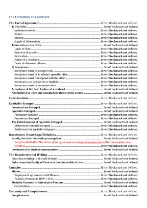 These Contract Law (LAW104) notes contain each RULE of contract law. The notes then clearly details the: 1. Requirements for each rule 2. Authority to the rule 3. Relevant legislation (and applicable section number for the rule) 4. Exceptions to the rule 5. Authority for the exceptions to the rule 6. Relevant Legislation for the exceptions to the rule. The Notes are clearly organised with a contents page. All rules are in RED, authority cases are in GREEN, back-up cases in BLACK, and legislation in BOLD
