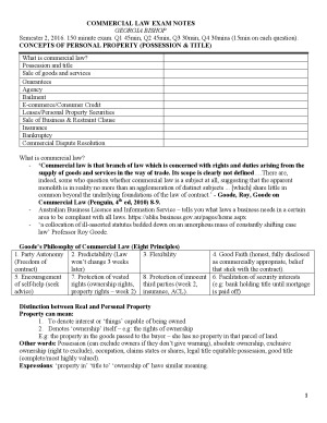 A detailed, comprehensive commercial law exam with full case briefs and notes from the lectures provided by the lecturer. It includes time length for the exam questions and a table of contents as well as quotes to use in describing principles, and comprehensive descriptions of doctrines, and the PPSA/PMSI.