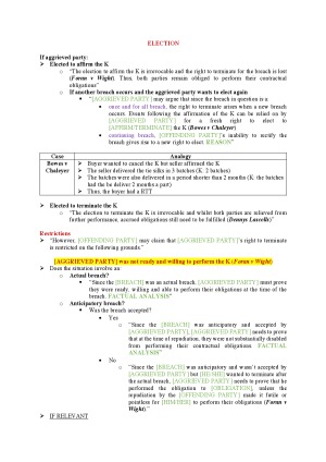 I have summarised a semester's worth of content into a concise and exam-friendly (colour-coded) booklet that can be easily navigated under exam conditions. Tabulated case summaries are present to allow one to quickly analogise with the facts. I used these templates to secure myself a HD for this unit and I'm sure they will pave the same path to success for you. Legend: Highlighted in yellow - cover only if relevant to the facts Coloured in green - replace with relevant key words from the facts Coloured in orange - copy if time permits Coloured in purple - if you are running out of time, make sure you at least copy down these key words TABLE OF CONTENTS: Termination by Agreement Termination for Breach Repudiation Termination for Delay Election Damages Liquidated Damages or Penalties? Specific Performance and Injunction Restitution Action for Debt Frustration Misleading or Deceptive Conduct Duress Economic Duress Undue Influence Unconscionable Dealing Unconscionable Dealing (Emotional Dependence) Impropriety by 3rd Parties Unconscionable Conduct under Statute CL Remedies for Vitiating Factors Statutory Remedies for Vitiating Factors