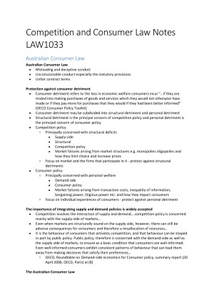 Comprehensive notes for LAW1033 separated into two separate sections for ease during the exam where questions are divided into a consumer law question and a competition law question. Great for use during exam for quick reference with plenty of example cases and the relevant case law for each section. Contains only lecture content
