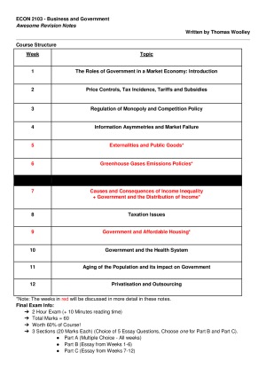 I got a HD in this course purely remembering the information on these notes. These notes cover: 1 The Roles of Government in a Market Economy: Introduction 2 Price Controls, Tax Incidence, Tariffs and Subsidies 3 Regulation of Monopoly and Competition Policy 4 Information Asymmetries and Market Failure 5 Externalities and Public Goods* 6 Greenhouse Gases Emissions Policies* 7 Causes and Consequences of Income Inequality + Government and the Distribution of Income* 8 Taxation Issues 9 Government and Affordable Housing* 10 Government and the Health System 11 Aging of the Population and its impact on Government 12 Privatisation and Outsourcing