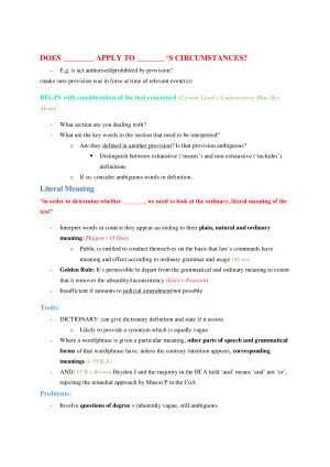 These are my notes for the statutory interpretation component of pub law. It is a big map of how to go through a statutory interpretation problem and the elements you need to cover. I have authority for each point and this is colour coded. I have also included case notes and exam tips that were given in the lectures. These notes are a really good guide to how to go about a problem and combine all the relevant knowledge from FoL and all the public law info you're given through the semester into one.