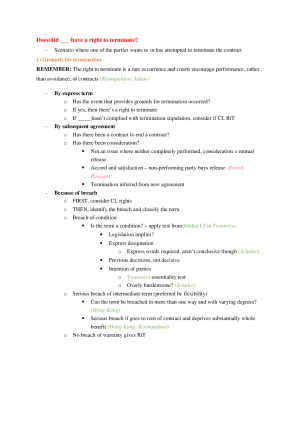 These are my notes for Contract B. They're divided into sections with maps of how to approach the different contracts problems and the elements needed to cover in each problem. I have authority for each point and this is colour coded. I have also included case notes within the relevant topics and exam tips that were given in the lectures. There is also some conceptual points about the subject generally and notes on relevant policy issues (big case note on penalties for late fees inc). I have put the problem maps all in to one document but I had these separate in the exam. The preview I've uploaded is a map for a termination problem.