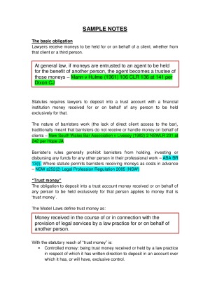 A comprehensive summary of Professional Responsibility and Legal Ethics, summarised directly through multiple sources, including the textbook, tutorial class notes, and case law. This 116-page set of notes includes content for all topics which were assessable in the final exam - including theory, concepts, explanations, examples, and of course, plenty of cases! Contains: - Chapter 6: Communication Skills - Chapter 7: Advocacy - Chapter 8: Etiquette - Chapter 9: Cross-cultural Communication - Chapter 10: Aboriginal Clients and Witnesses - Chapter 11: Criminal Law Practice: Defending Aboriginal People - Chapter 13: Lawyer-Client Relationship - Chapter 14: Lawyers’ duty to the client in Tort - Chapter 18: Legal Professional Privilege - Chapter 19: Legal Professional Privilege - Chapter 20: Duty to Account - Chapter 21: Costs Disclosure and Costs Agreements - Chapter 22: Duty to the Court - Chapter 23: Duty to Obey and Uphold the Law - Chapter 24: Criminal Practice - Chapter 25: Professional Colleagues and Third Parties - Chapter 26: Lawyers Acting as Mediators: Ethical Dilemmas in the Shift from Advocacy to Impartiality - Chapter 27: Undertakings - Chapter 28: Lawyers as Victims - Chapter 29: The Disciplinary Jurisdiction - Chapter 30: Types of Misconduct