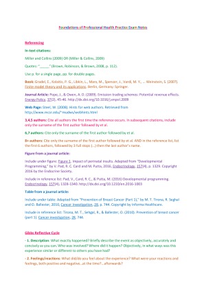Summary of content taught in Foundations for Professional Health Practice. Was used to study for exam and to compile double-sided exam cheat sheet. 'Colour-blocked' for ease of reading and studying. Received high distinctions on all assessments and an overall mark of 90% in this unit.