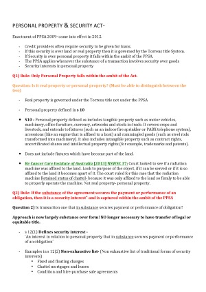 These Commercial law notes contain notes on: - The PPSA (including a breakdown of PMSI & priority disputes) - The SOGA (Including implied terms and a breakdown of the PASSING OFF of risk) - Insurance - Bankruptcy Contained in each summary is a step-by step on how to answer a problem question for each topic ,the authority cases you MUST reference and the SECTION to relevant legislation you must CITE! I have also included a detailed summary of each authority case you are required to know for these topics. I have clearly listed the: 1. Importance of the case 2. Facts of the case 3. Ruling of the case 4. If the case is PRE or POST PPSA 5. How to use the case for the These notes are ready to use while doing your Commercial law exam! Cases are colour coded in green, sections for relevant legislations are bolded, and steps on how to breakdown each problem question is numbered.
