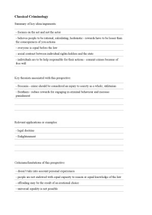 These notes outline each of the Theories studied in Understanding Crime, including a summary, key theorists, relevant examples, and criticisms of the perspective.