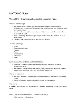 Extensive notes on all topics within MKTG100. Set out by weekly topics. Really helped me get my distinction. Super helpful diagrams from the textbook to make things clearer. Final short summary of all topics at the end of the document.