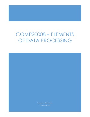 This note set covers the full subject of COMP20008 – Elements of Data Processing. The content of these notes was derived from lecture notes, lecture recordings, tutorial content and examples. The notes include multiple diagrams, tables and syntax-highlighted code example blocks. The topics covered are: - Data Format and Storage - Data Pre-Processing and Cleaning - Recommender Systems and Missing Values - Outlier Detection - Visualisation and Clustering - NoSQL Database Management Systems - CouchDB - Record Linkage - Correlation - Classification and Regression - Classification Methodologies - Public Data Release - Location & Trajectory Privacy If the notes are opened using Adobe Reader, each topic and its relevant sections will be available in the 'Bookmark' tab. Don't forget to check out my other IT notes: INFO20002 – Foundations of Informatics & INFO20003 - Database Systems