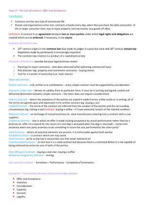 These notes summarise each topic taught throughout the semester and will be really helpful for the open book exam. I also have all the cases mentioned in the notes summarised in a table so feel free to message me if you want these as well! Topics Included: - Intro to Law and the Australian Legal System - The Law of Contract: Offer and Acceptance - Intention, Consideration, Formalities, Capacity & Consent - Contents of the Contract: Express and Implied Terms - Termination and Remedies of a Contract - Consumer Law: Misleading and Deceptive Conduct - Law of Torts: Negligent Acts Causing Damage - Negligent Statements - Partnership Law - Corporations Law