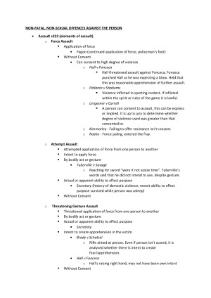 High level, easy to follow exam notes for LAW1113. Clearly sets out the elements for each offence to save time in the exam. Important/relevant case references included where appropriate, with only a brief description of what the case is.