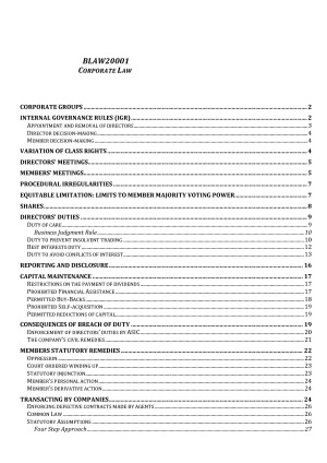 Comprehensive and guided notes to BLAW20001 Corporate Law. I received a high 90+ H1, with these notes being updated to reflect the current course information. Beginning with a table of contents, it's easily to follow the outlined process in the notes to answer any question.