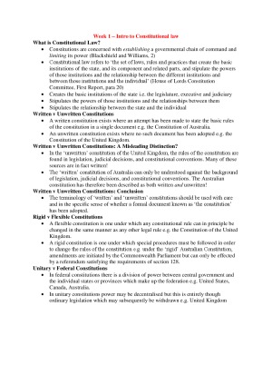 Constitutional law notes - 200009. Covers all topics in detail. All cases, all statute, all principles. Complete notes to help you answer questions in the exam.