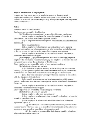 These notes contain concise and comprehensive detail of all examinable topics for MLL342 Workplace Law (Topics 3,4,5,6,7 and 9) and are all you need to succeed in the exam. These notes helped me to achieve an 82 HD in Workplace Law. These notes contain brief summaries of the topics, followed by relevant legislation and key cases so that even a student who has done minimal work will be able to answer the question in a succinct manner and address relevant law/ key issues in the appropriate order for an exam. These notes are very succinct and all inessential material was removed- no unnecessary verbiage has been included for your benefit.