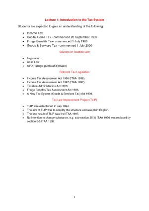 Extensive 79017 Taxation Law Notes compiled from both the Lecture and Tutorial slides in addition to notes from the 2 recommended textbooks and the workbook. These notes include a thorough analysis of concepts such as: - Introduction To The Tax System - Ordinary and Statutory Income - Fringe Benefits Tax - Goods and Services Tax - Capital Gains Tax - Deductions I - Deductions II - Trading Stock, Tax Accounting and Small Business Entities - Sole Traders and Partnerships - Companies and Shareholders - Trusts and Superannuation - Tax Administration, Tax Planning and Anti Avoidance Problems