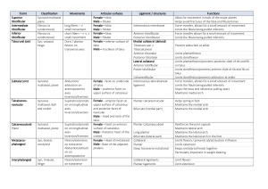 End of semester exam revision document for ANAT101 with tables for all lower limb joints, muscles of the leg, foot, hip and knee, nerve distributions, lower limb myotomes and dermatomes, movements of the pelvis.