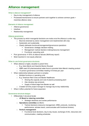 Comprehensive notes used for the final exam, including course readings, lectures, tutorials and case studies. Contains: What is alliance-making? Alliance examples Alliance formation Alliance design Alliance management Alliance performance Alliance capability Co-opetition and constellations Alliance case studies