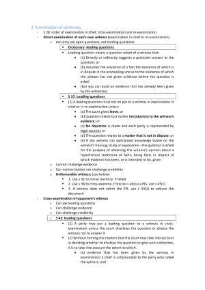 This note is a detailed account of all the materials covered in LAWS5013 Evidence. It provides a step-by-step guide to the procedure of adducing and tendering evidence in various circumstances, combined with detailed case summaries. The more than 40,000 words note covers: 1. burden of proof 2. standard of proof 3. prima facie case 4. calling of witness 5. competence and compellability 6. examination of witnesses 7. Browne v Dunn rule 8. re-examination 9. real evidence 10. Relevance 11. Hearsay 12. Admission 13. Credibility 14. Opinion 15. Character 16. Tendency and coincidence 17. Discretionary exclusion and limits on use 18. Judicial notice 19. missing witness/evidence 20. warnings: potentially unreliable evidence