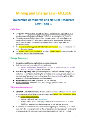 Concise and meticulous Mining and Energy Law EXAM Notes MLL316 (Deakin University), using both the textbook, lectures and other resources. 108 Pages. Topics include: Ownership of Minerals and Natural Resources Law, Resource Titles- Permits, Licenses and Leases, Australian Offshore Regulation, Climate Change Issues for the Mining and Energy Sector, Environment Regulation, Gas Law Regulation, Unconventional Gas Regulation, Renewable Energy Solar and Wind, Royalties and Profit Sharing Agreements and Geosequestration: Carbon Capture and Storage Regulation in Australia.
