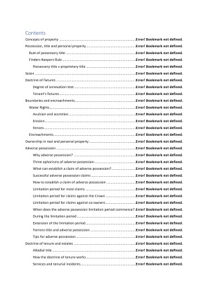 These notes feature two pages of numbered contents, important concepts of property law defined, clear headings and cases outlined according to the IRAC method. Note: contents pages do not appear in the sample but are in the full version.