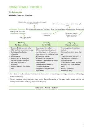 Full subject notes derived from lectures and textbook with diagrams included. Content includes: - An Introduction to Consumer Behaviour - The Psychological Core I — Motivation, Ability & Opportunity (MOA) - The Psychological Core II — From Exposure to Comprehension, Memory & Knowledge - The Psychological Core III — Attitudes - The Process of Making Decisions I — Problem Recognition & Information Search - The Process of Making Decisions II — Judgement & Decision Making Based on High Effort - The Process of Making Decisions III — Judgement & Decision Making Based on Low Effort - The Process of Making Decisions IV — Post-Decision Processes - The Consumer’s Culture I — Consumer Diversity - The Consumer’s Culture II — Social Class & Household Influences - The Consumer’s Culture III — Psychographics: Values, Personality & Lifestyle - The Consumer’s Culture IV — Social Influences on Consumer Behaviour