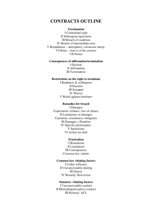 Exam preparation notes with a good structure to use in answering exam questions. Includes structure for termination, consequences of termination, restrictions on the right to terminate, remedies for breach, frustration, common law vitiating factors and statutory vitiating factors.