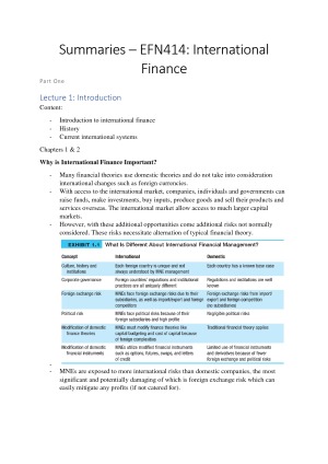 Detailed lecture summaries of all lecture content throughout semester. Covers all class material including international financial markets, currency exchange systems, international monetary funds, exchange rate calculations including via parity conditions, arbitrage theory and fisher theory. Also includes currency derivatives such as futures, options and swaps, risk management and hedging, capital budgeting and political risk, international trade agreements and international portfolio management and analysis. Contains highlights of key topics for examination.