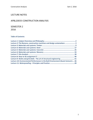 Construction Analysis - Comprehensive lecture notes The notes were made by listening to each lecture at least twice and by reviewing the lecture slides afterwards as well as researching concepts online to make sure minimal details are left out. - 60 pages - Table of contents for easy navigation - Neat and clear formatting - Headings, titles, sub headings, bolded and highlighted important parts - Includes building examples listed at the end of each lecture. *needed for exam - Includes useful diagrams and pictures (sourced from lecture slides) *needed for exam *These notes were my only source of revision for the exam. *Notes were modified after the exam to include common topics seen throughout.