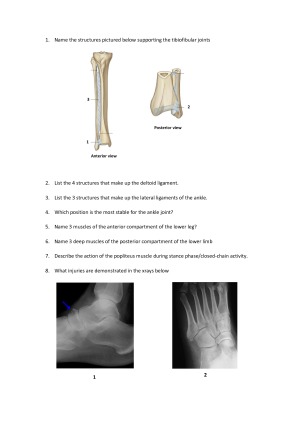 This practice exam was put together for the podiatry students I tutor. It includes a total of 94 short answer Q's based on the learning objectives from each lecture. Both anatomy and biomechanics content is included and an answer sheet provided.