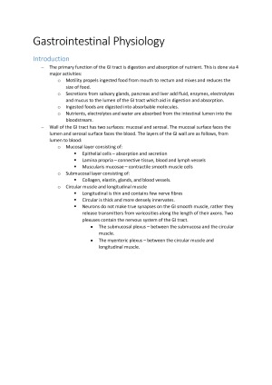 32 page summary of gastrointestinal physiology based on lectures and textbook resources specific to the objectives of BMS2031 2017.