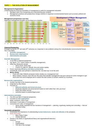Lecture, Tutorial & Textbook notes Contains: Topic 1 – The Evolution Of Management Topic 2A – The Environment Of Management (Basic Structures And Functions Of Contemporary Organisations) Topic 2B – The Environment Of Management (Ethics, Social Responsibility And Sustainability) Topic 3 – Managing Change Topic 4 – Human Resource Management Topic 5 – Individual Behaviour In Organisations Topic 6 – Individual Behaviour In Organisations Topic 7 – Motivating Employees Topic 8 – Communication Topic 9 – Team Building Topic 10 – Sustainable Operations, Managing The Value Chain, It & E-Business