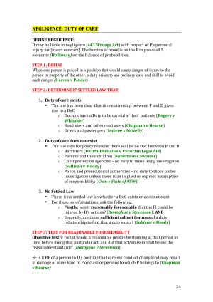 Clear and easy to follow exam notes for TORTS. Step by step processes for each TORT. Battery Assault False Imprisonment Defences to Trespass Remedies Trespass to Land Defences Remedies Negligence Defences Damages VL