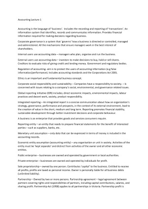 Accounting notes detailing all lectures, 1 through 11 (revision). Has all information provided in the lectures, including some exam help.