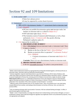 ALL RELEVANT CONTENT FROM LECTURES, TUTORIALS, PASS SESSIONS, TEXTBOOK AND ALL OF THE VIDEO SUMMARIES! Comprehensive, detailed notes with a very easy colour-coded structure to follow- includes relevant case names from textbook readings in red font for easy finding. Most importantly includes a standard colour-coded structure when answering problem questions which is extremely helpful and gives examples. Footnotes also included for brief case summaries/ explanations. Topics are titled big and clearly on separate pages for easy finding.