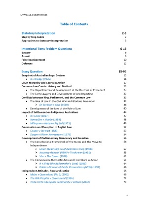 Complete LAWS1052: Introduction to Law & Justice EXAM notes ready to take into open book exam. Divided into 3 sections as per exam paper: 1) Statutory Interpretation, 2) Intentional Torts, 3) Essay Question on Assessable Topics. Includes step-by-step instructions and key info organised into easily accessible tables for problem questions, as well as thorough notes from the lectures and the textbook + summarised case briefs for ALL relevant topics that could be the basis for the essay question in the exam.