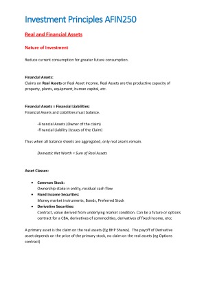 Comprehensive study notes based on Lecture notes and important Tutorial and Homework examples. With the right notes and preparation, you can perform well in AFIN250 across the quizzes, essays and exams throughout the semester. My notes cover all difficult questions that can be covered within the unit on the many topics introduced as well as providing accurate diagrams with explanations and relevant links to the current globalised Financial System. Good luck!