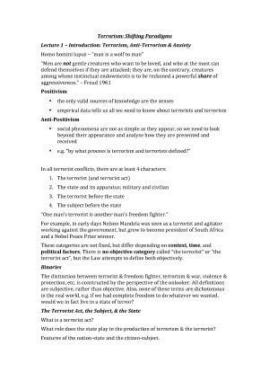 In-depth, complete lecture summary for MULT 20007: Terrorism: Shifting Paradigms. Using these notes, I achieved a mark of 81 (H1 grade).