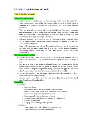 MLL110 - Legal Principles and Skills notes incorporating information for textbooks, lectures and lecture slides and detailed case notes. Colour coded: Yellow: new topic Green: new topic subsection Blue: cases Pink: legislation Case notes give brief description of facts, the issue and judgment. All sorted in alphabetical order. Blank pages to ensure when printing to bind each new topic starts on a new page. I would bind with small dividers separating each topic and large dividers separating topic notes, case notes and any relevant legislation. Contains: Topic 1: The Law in Practice Topic 2: Law and Justice Topic 3: Legal History and the Australian Legal System Topic 4: Legal Research Skills Topic 5: Sources of Law Topic 6: Legal Reasoning Topic 7: Interpretation Skills