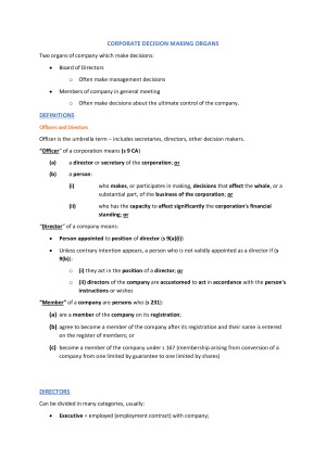 2017 Complete Corporate Law 70417 Notes Includes: * Complete Notes * Answers to the 8 Tutorials * Lecture Notes & Reading Materials * Case Law summaries and Legislation Useful for: * Mid semester Assignment * Lecture * Tutorials * Lectures * Final Exam Topics covered: * Contextual, Ethical and Theoretical Issues * Partnership & other business structures * Types of company formed under Corp Act, insolvency & Corporate Personality * Corporate Personality Part 2 * Introducing Directors * Corporate Decision making organs * Corporate Fundraising * Directors'/Officers Duties: Duty of care, skill & diligence and insolvent trading. * Directors'/Officers Duties: good faith/proper purpose * Conflict of interest * Shareholder remedies