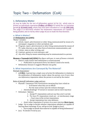 Complete Exam Notes for Media Law 2. Covers all examinable topics, including: Freedom of Speech Defamation Defences Remedies Breach of Confidence Privacy