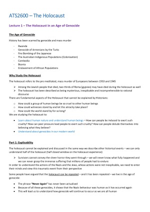 These notes summarise the content for each of the topics taught in ATS2600. The lecture slides for this unit are very brief so these notes provide the detail you need for the end of semester test. Topics Included: - The Holocaust in an Age of Genocide - Jewish Life in Pre-War Germany - Jews in the Nazi World View - A Twisted Road to Auschwitz - Writing on the Wall - Gender and the Holocaust - Life and Death in the Ghettos - The Transition to Murder - Complicity and Collaboration – France and Poland - Responses to Murder - The Concentration Camp Universe