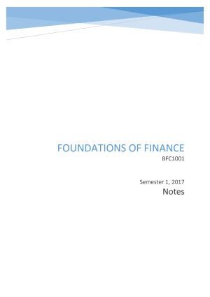 These notes have been constructed to provide a comprehensive reference for Foundations of Finance, with explanations, formulas and diagrams compiled into a well presented document. They can be used as a reference alongside your own personal notes and/or a last-minute reference to print out for your mid-semester test or exam. In over 60 pages of content, these notes cover all topics of BFC1001 in a clear and concise manner. Ultimately, they helped me achieve a grade of HD for the unit. The combination of presentation, clarity and detail in these notes makes them a worthy investment for success in this unit.