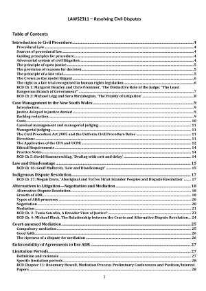 Comprehensive exam notes for LAWS2371 - Resolving Civil Disputes. Includes summary of assigned reading from the little textbook (Legg's Resolving Civil Disputes). Got 83 for the course.