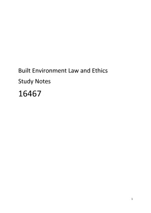Attached are comprehensive notes for the subject '16467 - Built Environment Law and Ethics', detailing all topics in the lectures. These notes are helpful study material for this subject as it contains relevant content, as well as diagrams and examples from the lecture and textbook. Further, this can be purchased in conjunction with 'Built Environment Law and Ethics - Detailed Evidence', which includes helpful cases that further explain the content.
