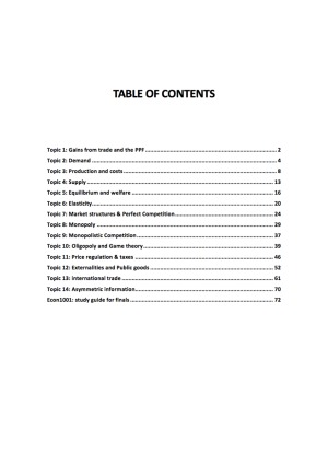 Selling Complete ECON1001 notes that have helped me receive distinctions in the mid semester and final exam. These notes have been extracted from lecture slides, tutorials and from my own research. They are categorised and organised according to the unit outline with detailed diagrams and tables that explain each topic. Included is also a finals study guide!