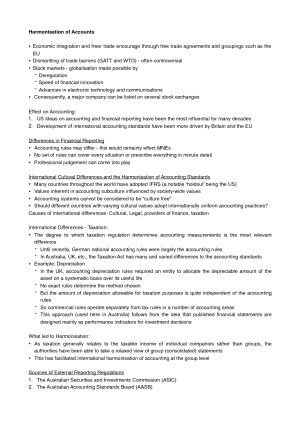 Detailed summary on topics included during the final exam for the autumn session of International Accounting. 1. Qualifying assets 2. AASB 139 and the application of hedge accounting 3. Simple FX transactions 4. International Taxation – especially the Chevron case. 5. Harmonisation of accounting standards. Based on the new format of the subject. (Completed the subject with a distinction).