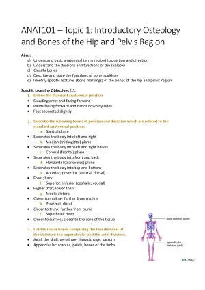 1. Introductory Osteology and bones of hip and pelvis 2. Introductory Arthrology and the Hip Joint 3. Introductory Myology and Muscles of the Hip Region Notes on all the dot points of topic 1-3 including pictures from text to aid learning and completion of suggested directed independent learning activities. NOTE!: Revised multiple times to remove unnecessary content for end of semester exam. Notes are thorough but succinct to only include what is required for end of semester exam.